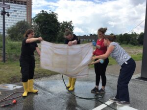 Wie sich herausstellte, wurden auch museale Objekte aus dem verschlammten Magazin geborgen, die dort aufgrund von Baumaßnahmen in den eigentlichen Gebäuden vorübergehend untergestellt worden waren. Diese Objekte wurden zunächst ins Rathaus gebracht. Die Archivalien, vornehmlich Aktenordner und Pläne, wurden im Container und unter den beiden Pavillons des Kölner Notfallverbunds, die zum Inventar des Containers gehören, vorsichtig abgespült, d.h. vom gröbsten Schmutz befreit und anschließend in Folie eingestretcht. Nach dem Durchlaufen dieses Workflows wurden die versorgten Materialien an der Rückseite des Containers auf Palletten für den Abtransport zur Einfrierung gestapelt.