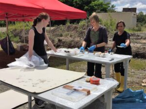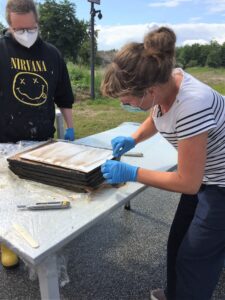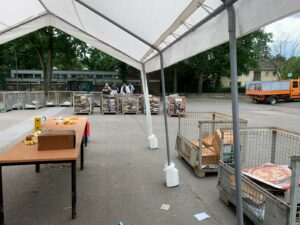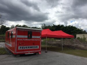 Der zweite Einsatz des frisch gereinigten Notfallcontainers fand aufgrund eines Amtshilfegesuchs statt. Nach reiflicher Überlegung wurde beschlossen, den Container nicht in das Krisengebiet an die Ahr zu bringen, sondern geborgene Objekte in Köln zu versorgen. Dazu wurden der Notfallcontainer und die beiden Pavillons auf dem Parkplatz vor dem Historischen Archiv aufgebaut. Kolleg:innen der Feuerwehr Weimar / Kulturgutschutz Thüringen, die über ein klimatisiertes Spezialfahrzeug zur Kulturgutrettung verfügen, transportierten die völlig verschlammten Objekte an drei Tagen (Fr.-So., 30.7.-1.8.) nach Köln.