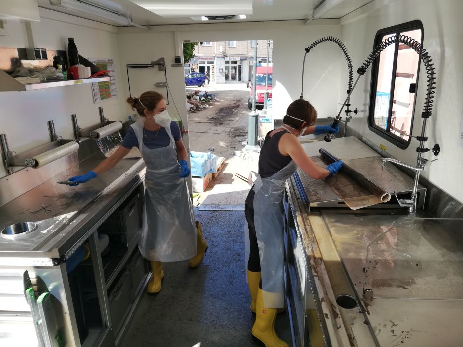 Fazit ist: Der Kölner Notfallcontainer hat diese erste Bewährungsprobe glänzend bestanden. Wir haben bei diesem Einsatz mehr lernen können als in jeder „Trockenübung“. Die Erkenntnisse, die wir aus der Einsatzwoche mitgenommen haben, führen nun zur Optimierung des Notfallcontainers. So werden z.B. die beiden Arbeitsplätze zur Trockenreinigung in weitere Spülstationen umgebaut, da wir aufgrund der klimatischen Bedingungen auch in Zukunft mit den Folgen von Starkregenereignissen rechnen müssen.