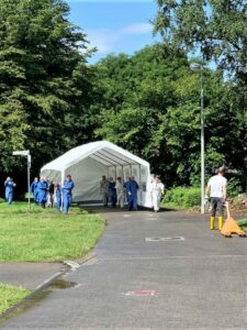 Die Corona-Pandemie hatte es bis dahin verhindert, dass wir mit und im Notfallcontainer üben konnten. Der Einsatz in Stolberg bedeutet demnach, dass on the fly-Arbeiten im Echtbetrieb unter den Maßgaben des Covid19-Schutzes, d.h. im Container eingesetzte Helfer trugen FFP2-Masken.